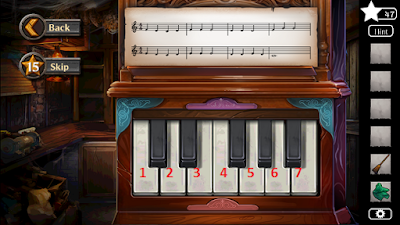 В комнате жилого помещения стоит музыкальный инструмент. На нем необходимо играть определенную мелодию. Ноты расположены наверху, смотрим и нажимаем на клавиши. Последовательность можно прочитать на изображении, где я написал.