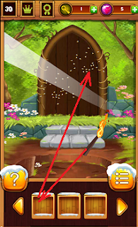 На 30 уровне подбираем палку и тряпку, затем увеличительное стекло. Обматываем палку тряпкой, чтобы сделать факел. Устанавливаем на луч света и сверху лупу. В результате загорается факел, который применяем на дверь