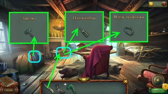 В комнате из синего пальто вынимаем заколку и затем сверху сундука убираем это пальто и куртку. Внутри комнаты при помощи ножа в ящике вытаскиваем моток проволоки и плоскогубцы