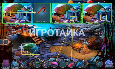 Берем амулеты полумесяца и ставим их в окошки на закрытом ящике. Внутри забираем нож. Разрезаем ножом сети и проходим мини игру по поиску предметов. В итоге получим канистру с топливом. Заправляем лодку из канистры топливом и вперед на катере в следующую локацию